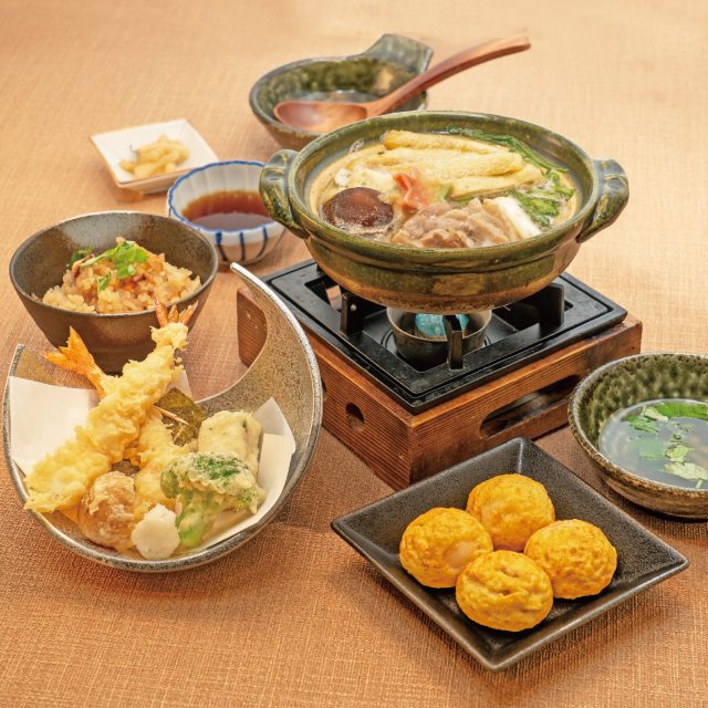 特製お出汁で合鴨、旬の野菜をグツグツ炊き込んだ鴨鍋。合鴨の旨味とお出汁の香りをまとったうどんで心も体もぽっかぽか!名物玉子焼、旬の野菜を使用した揚げたて天ぷらと具材の旨味を味わう炊き込みご飯が付いた御膳です。