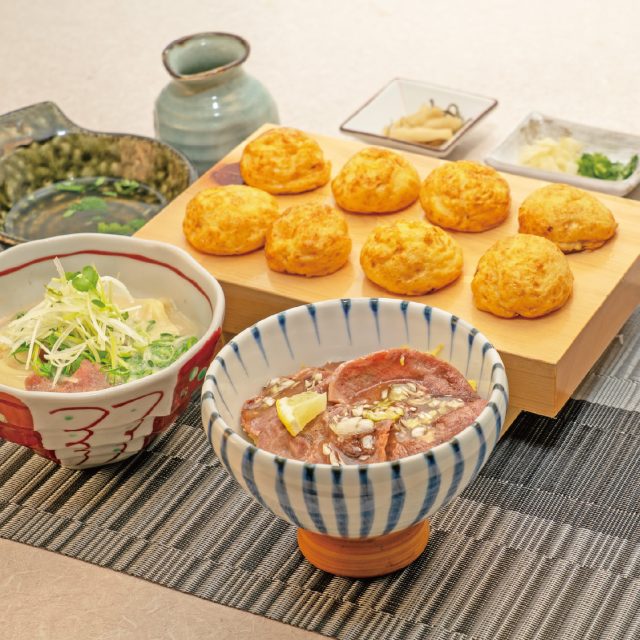 名物玉子焼に柔らかい牛タンとネギ塩だれを合わせた牛タン丼、牛骨のコクと特製お出汁を合わせた牛骨スープにも牛タンと2種類のネギを合わせたうどんをご用意しました。特製お出汁を味わう一品です。ご賞味くださいませ。