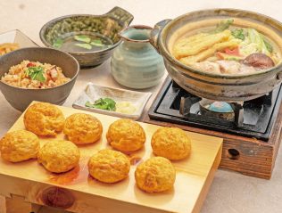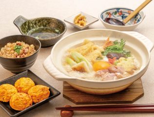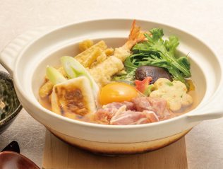名物玉子焼と九州産華味鳥を使用し、特製お出汁とたっぷりの具材で旨味が染み渡る、特製なべ焼きうどん。